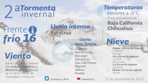 Este viernes la Segunda Tormenta Invernal sobre el noroeste del país y el frente frío número 16 extendido desde la porción media del Golfo de México hasta el norte de Veracruz mantendrán bajas temperaturas en la mayor parte del territorio nacional, informó el Servicio Meteorológico Nacional (SMN).