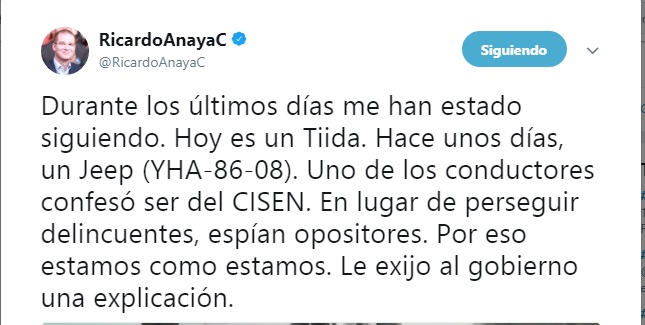 El precandidato de la coalición Por México Al Frente, Ricardo Anaya, denunció espionaje, pues “durante los últimos días me han estado siguiendo”.