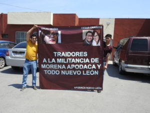 En la protesta que se realizó en el exterior del Club de Leones de Apodaca, los inconformes mostraron también una manta donde acusaban de traidores a la líder del partido y al Diputado Federal César Cavrioto.