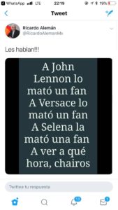 Alemán reprodujo en su cuenta de esta red social, que es seguida por 156,000 usuarios, una imagen en la que se puede leer “A John Lennon lo mató un fan. A Versace lo mató un fan. A Selena la mató un fan. A ver a qué hora Chairos”, acompañado de las palabras “Les Hablan”.