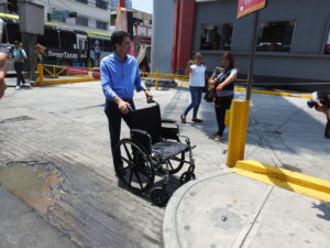 Empujando una silla de ruedas, el panista se trasladó desde Pino Suárez y Padre Mier hasta la Plaza La Purísima, donde se topó con más de 30 obstáculos.