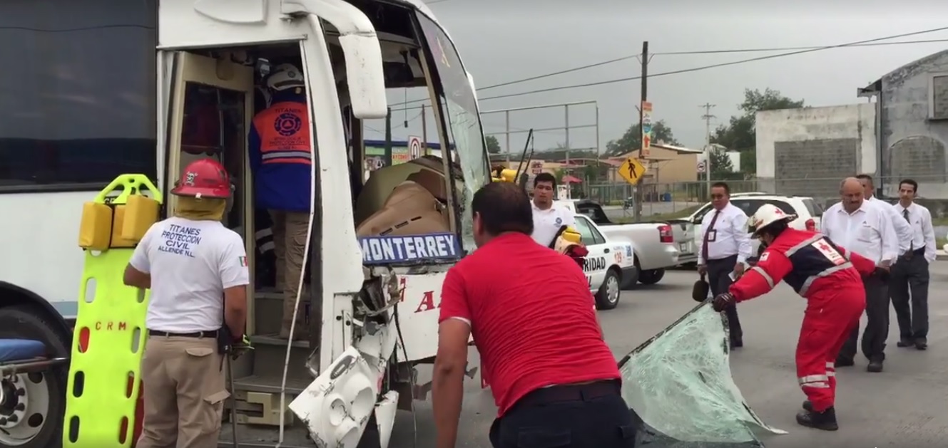 Presuntamente por no respetar la luz roja del semáforo, el Secretario de Seguridad de Allende, Nuevo León, resultó con fuertes lesiones, luego de que la camioneta en la que viajaba chocará con un autobús.