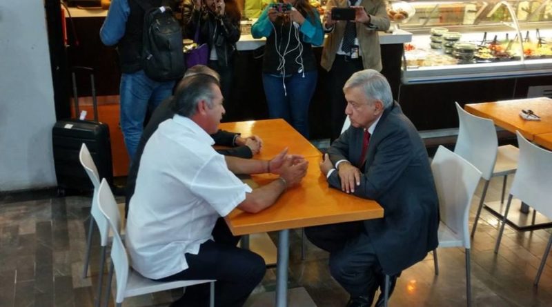 López Obrador y Rodríguez Calderón sostuvieron una plática informal en el área de comida rápida del Aeropuerto Internacional General Mariano Escobedo en Monterrey.