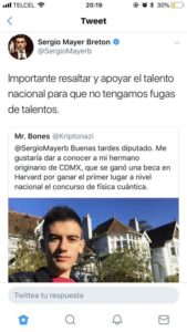 El diputado dio retuit al mensaje, al que agregó: “Importante resaltar y apoyar el talento nacional para que no tengamos fugas de talentos”.