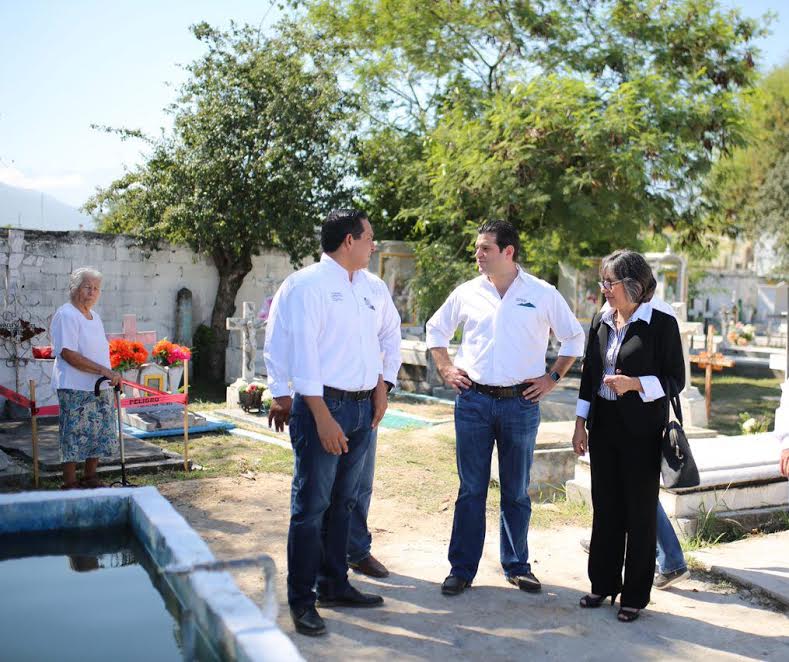 En su recorrido, el Presidente Municipal estuvo acompañado por el Secretario de Ayuntamiento, Epigmenio Garza, y el Secretario de Administración, Alejandro Espinosa Eguía, de quien dependen los panteones municipales.