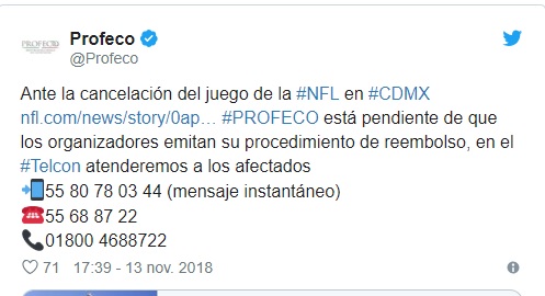 “Ante la cancelación del juego de la #NFL en México, el #Telcon te proporciona asesoría personalizada sobre tus derechos como consumidor. Les recordamos nuestros medios de contacto: 55-8078-0344 (mensaje instantáneo) y al 5568-8722”, informó.
