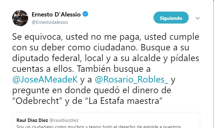 Ernesto D´ Alessio –como aparece en Twitter el diputado federal del PES-, respondió a Raúl Díaz, “se equivoca, usted no me paga, usted cumple con su deber como ciudadano. Busque a su diputado federal, local y a su alcalde y pídales cuentas a ellos. También busque a @JoseAMeadeK y a @Rosario_Robles_ y pregunte en dónde quedó el dinero de Odebrecht y de La Estafa maestra”, respondió el legislador, que preside la Comisión del Deporte.