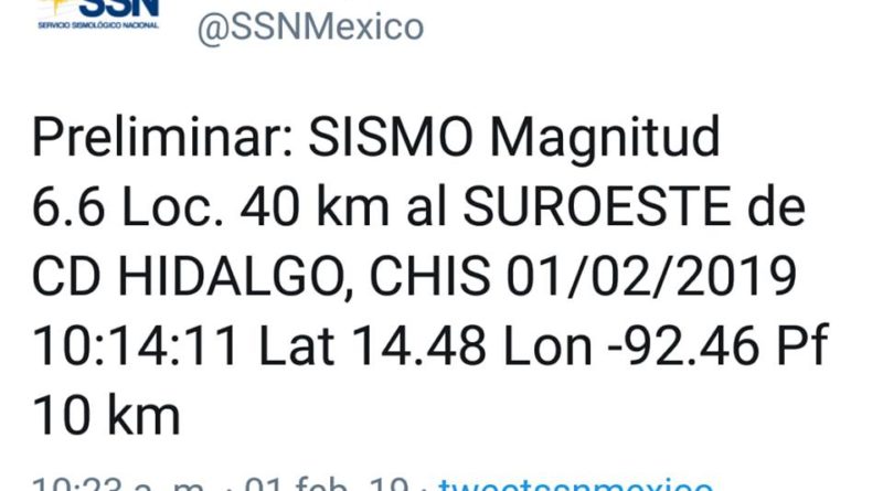 Este viernes se registró un sismo de magnitud 6.5 con epicentro 37 kilómetros al suroeste de Ciudad Hidalgo, Chiapas, entidad donde se sintió con gran fuerza, aunque hasta el momento no se reportan víctimas. En la zona fronteriza de Tecún Umán, en Guatemala, y Ciudad Hidalgo, hubo una gran sacudida. Se percibió ligeramente en la Ciudad de México (CDMX) y en redes sociales reportaron que también se sintió en Veracruz y Puebla.