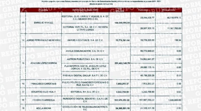Otros periodistas y empresas en la lista son Óscar Mario Beteta (74 mdp), Beatriz Pages (57.2 mdp), Comunicaciones Estratégicas Newlink (que Presidencia supuestamente asigna al comunicador conocido como Callo de Hacha, con 47.3 mdp), Raymundo Riva Palacio (31.1 mdp), Ricardo Alemán (25 mdp), Adela Micha (24 mdp), etc.