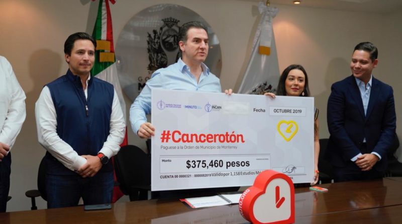 El alcalde de Monterrey, Adrián de la Garza Santos, recibió de manos de Águeda Anzúa Torres, del Patronato del Instituto Nacional de Cancerología (INCAN), un donativo por poco más de 375 mil pesos.