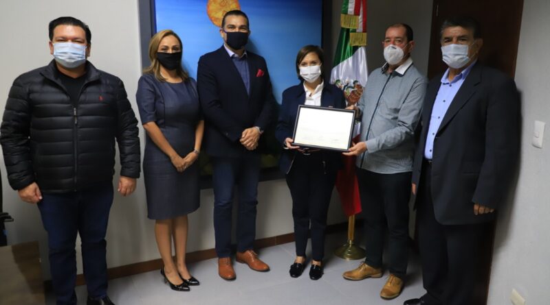 Antonio Tamez, Vicepresidente Regional de Canacar; Alfredo González Villegas, Director Regional Noreste; y Brenda Arredondo, Gerente de Servicios; entregaron el reconocimiento a la Presidenta Municipal, por el apoyo en la logística vial brindada al sector.