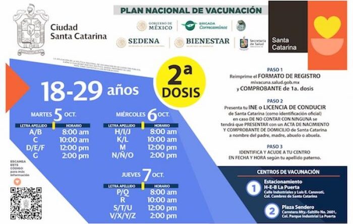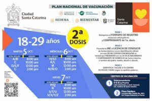 A través del Centro Integral de Atención Ciudadana CIAC cuyo número telefónico es 81 86 76 17 00 , se está proporcionando información respecto horarios, módulos de atención y requisitos para acudir a vacunarse, mientras que en las redes sociales oficiales de Santa Catarina estarán brindando todos los detalles, para que identifiquen el centro.