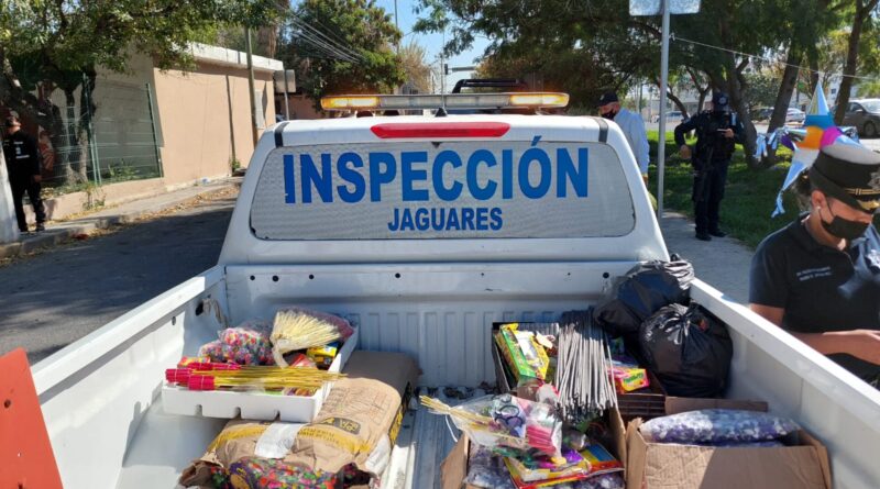 Elementos de Protección Civil, Policía, Ayuntamiento y de Desarrollo Urbano y Ecología participan en estas acciones, y detectaron venta de pirotecnia en un comercio de piñatas en la colonia López Mateos.
