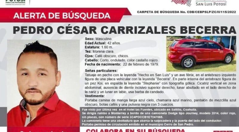 Pedro César Carrizales, “El Mijis”, fue reportado como desaparecido, informó la Comisión Estatal de Búsqueda de Personas San Luis Potosí.