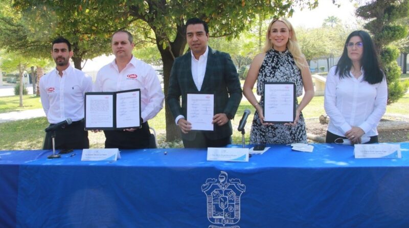 El Alcalde Jesús Nava Rivera; la presidenta del DIF Municipal, Paola García y el presidente de CMIC Nuevo León, Roberto Macías Quintanilla, firmaron el convenio, con el que también se busca mayor inversión en la industria de la construcción.