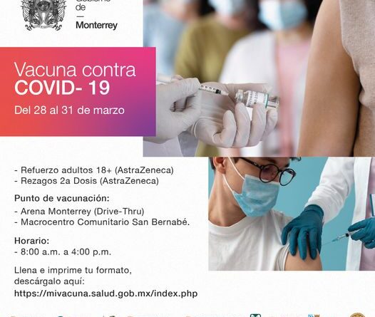 Mañana jueves 31 de marzo es el último día para que los regiomontanos mayores de 18 años, acudan por su refuerzo de la vacuna contra el Covid 19 a alguno de los dos módulos de atención en la Arena Monterrey, en modalidad drive thru, o en el Macro Centro Comunitario San Bernabé.