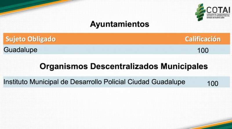 En la publicación reciente de la COTAI donde se detallan las evaluaciones, muestra que el Municipio de Guadalupe se ha mantenido con la máxima calificación, gracias al cumplimiento en la publicación de información en los portales de Internet y en la Plataforma Nacional de Transparencia.