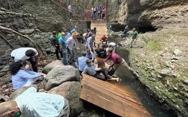 En las fotos que circularon en redes sociales se ve cómo el puente colgante de madera y las personas que caminaban sobre este cayeron al fondo de la barranca, en donde pasan aguas negras.