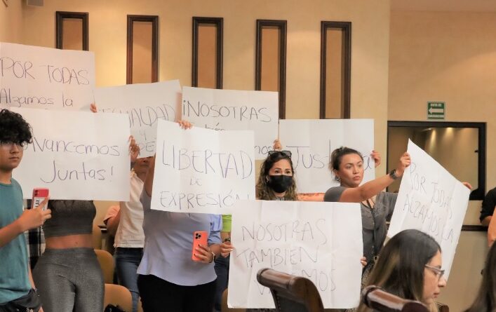 Al término de la sesión de Cabildo, las ciudadanas se manifestaron con pancartas que citaban frases, como “Avancemos juntas”, “ Por todas alzamos la voz” , y cuestionaron la forma del regidor en cómo se expresa de las mujeres.
