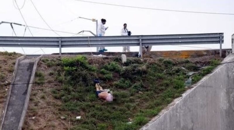 El hombre sin vida estaba sujeto de los pies a una cuerda, la cual fue amarrada al barandal de protección del puente conocido como Los Borregos, en el kilómetro 27 de la Carretera a Nuevo Laredo.