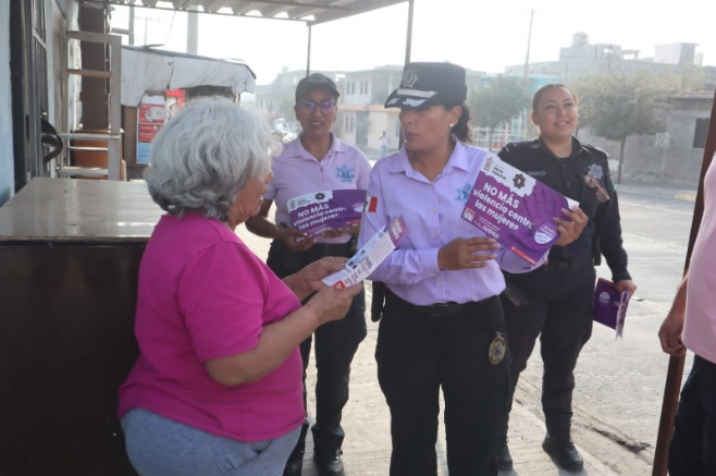En la colonia San Gilberto, donde se registran más reportes de violencia hacia las mujeres, se activó el reparto de dípticos a amas de casa y se pegaron calcomanías, esto por parte de personal de la Secretaría de Seguridad Pública y Vialidad.