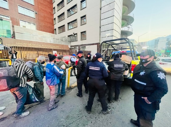 Los elementos municipales arribaron en dos patrullas al área que se ubica debajo del paso a desnivel de la avenida Gonzalitos donde de inmediato, familiares que esperan a su ser querido, que se encuentra internado, formaron una fila.