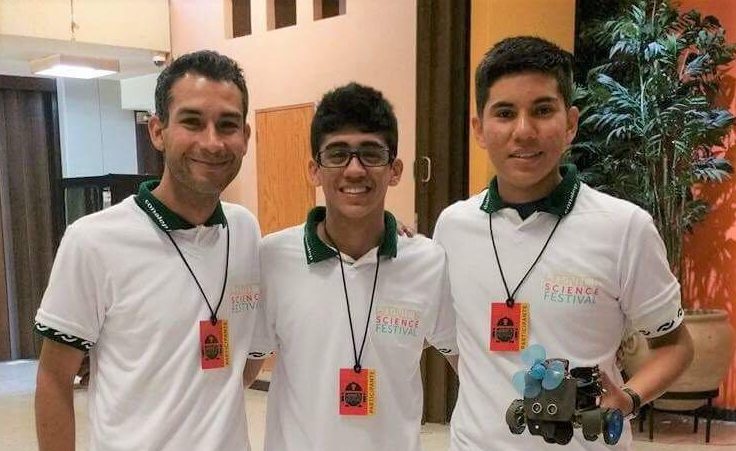 Los alumnos de CONALEP NL, Óscar Daniel Ríos Mercado y Emiliano Corona Romero, y su maestro, Leonel Armando Molina Dávila, conquistaron el primer lugar del Woznic’s Science Festival, en la categoría “Robot Hero’’.