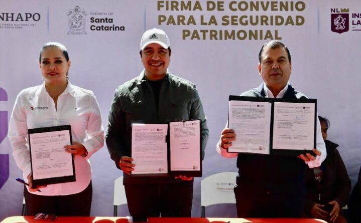 El Alcalde de Santa Catarina, Jesús Nava Rivera y Eugenio Montiel Amoroso, titular de Fomerrey, firmaron el acuerdo de escrituración de 480 viviendas para igual número de familias que fueron reubicadas a la Colonia Puerta del Sol, tras resultar afectadas por el Huracán Gilberto hace 35 años.