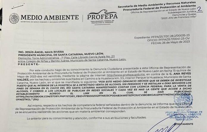 Luego de una denuncia ciudadana presentada en la representación de Profepa en Nuevo León, la propia instancia federal puso en conocimiento de la indagatoria al Alcalde de Santa Catarina, Jesús Nava Rivera.