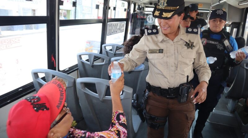 La distribución de agua helada en botellas de plástico, al interior de camiones urbanos, se inició en la avenida Manuel Ordóñez, frente a la plaza municipal, donde los policías municipales, comandados por Irania Jacobo Rodríguez, Directora de Policía de Proximidad de Seguridad Pública Municipal.