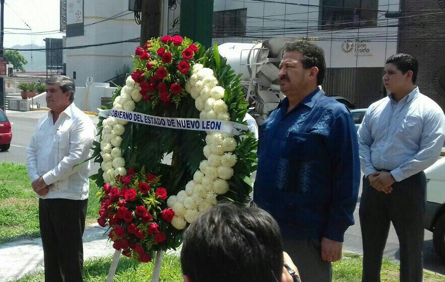 Manuel González, Secretario General de Gobierno y Genaro Alanís, Director de Gobierno, se instalaron en el camellón central en medio de una ofrenda floral con una cinta que tenía la leyenda del Gobierno de Nuevo León.
