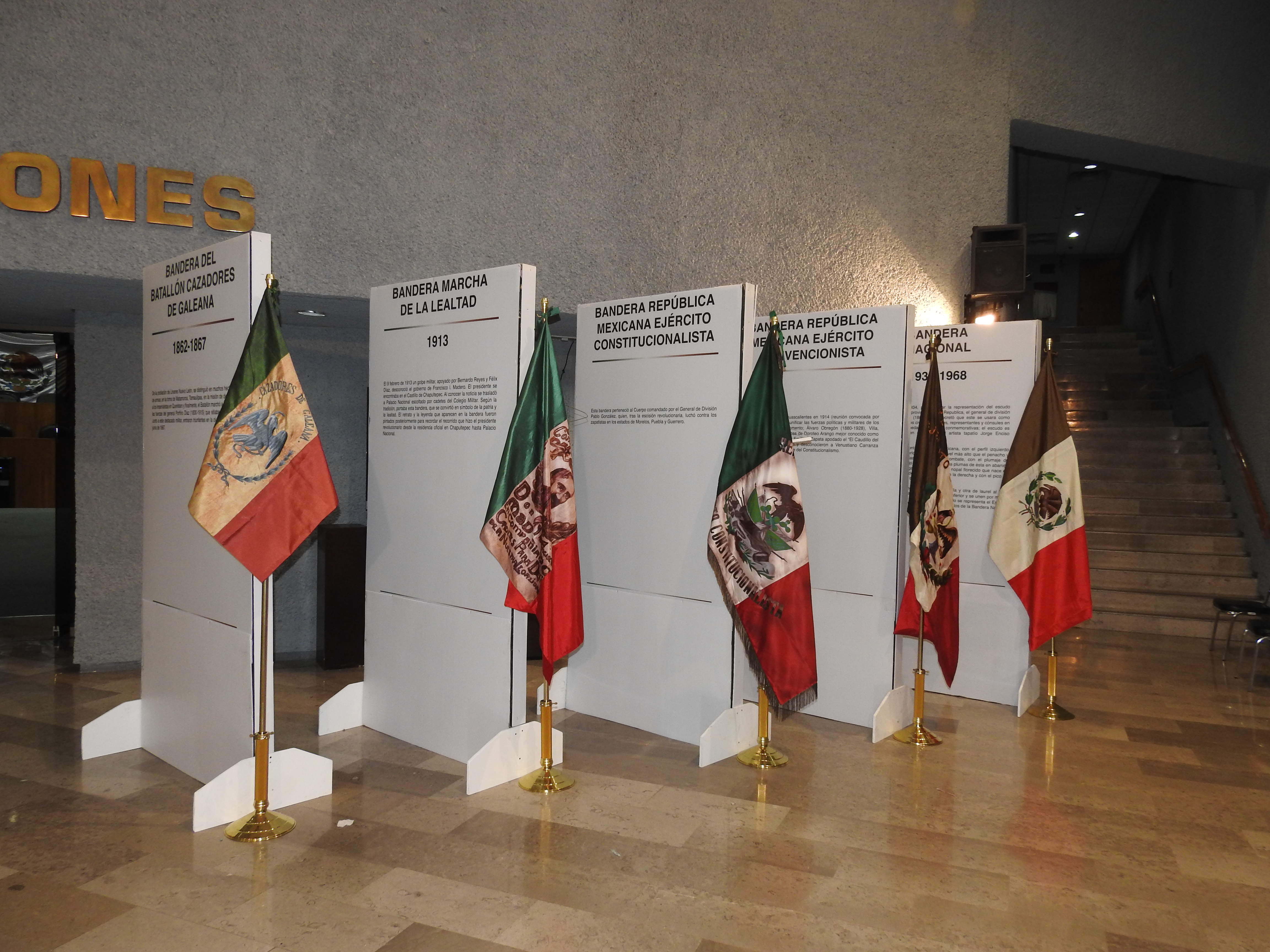 La exposición se compone del Estandarte Insurgente 1810 -1813, Bandera de José María Morelos y Pavón 1812 -1815, Bandera “El Doliente de Hidalgo 1811 – 1812, Bandera Regimiento de Infantería 1821, Bandera del Imperio de Agustín de Iturbide 1822 – 1823, Bandera Batallón Ligeros de Jalisco, Bandera del Batallón Activo de San Blas 1823 –1848, Bandera del Batallón de los Supremos Poderes 1864, Bandera del Segundo Imperio 1863 – 1867, Bandera del Batallón Cazadores de Galeana 1862 – 1867, Bandera Marcha de la Lealtad 1913, Bandera República Mexicana Ejército Constitucionalista, Bandera República Mexicana Ejército Convencionista, Bandera Nacional 1934 – 1968 y Bandera Nacional Estados Unidos Mexicano 1968 a la fecha.
