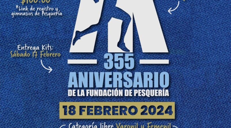Con motivo del aniversario 355 de su fundación, el municipio de Pesquería anunció que se va a realizar una carrera 7K el próximo domingo 18 de febrero, actividad que se sumará a otra serie de eventos que llevará a cabo la Administración Municipal en conmemoración de esta importante fecha.