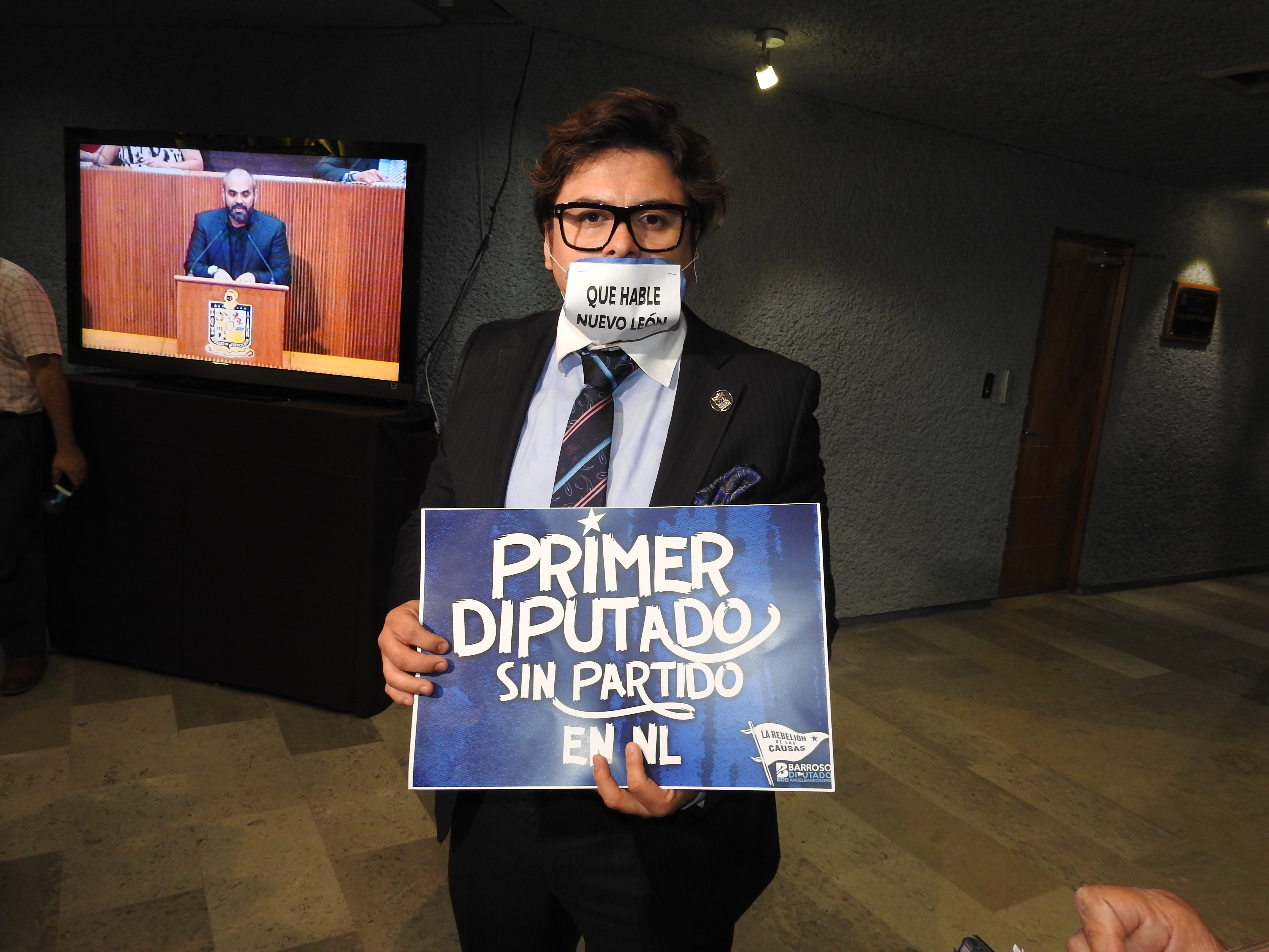 A formas de protesta el legislador uso un cubre bocas con la leyenda “Que hable Nuevo León” y una pancarta donde dice “Primer Diputado sin partido”.