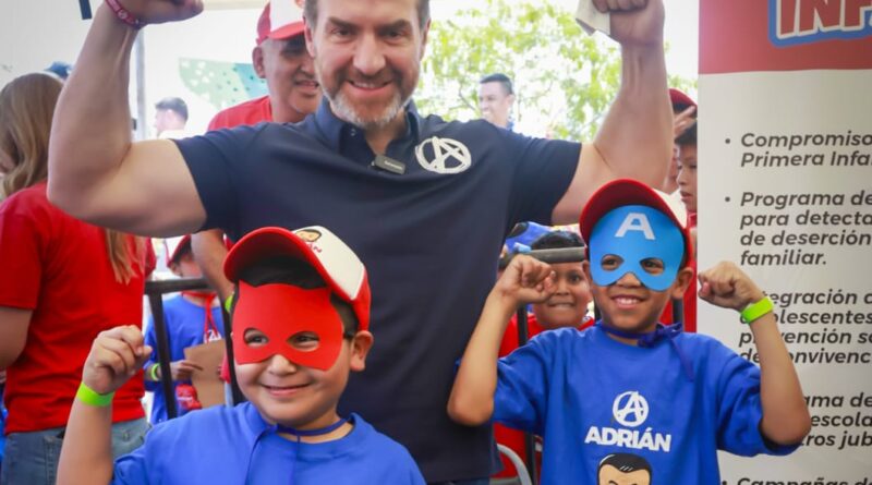 El candidato festeja por adelantado el Día del Niño y los complace portando la máscara de un superhéroe.