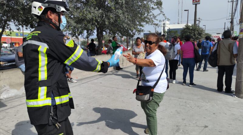 Para ayudar a mitigar las altas temperaturas, personal de la Secretaría de Protección Civil y Gestión Integral de Riesgos de García entregó agua embotellada a ciudadanos en paradas de camiones y en diversos puntos de las principales avenidas del municipio.