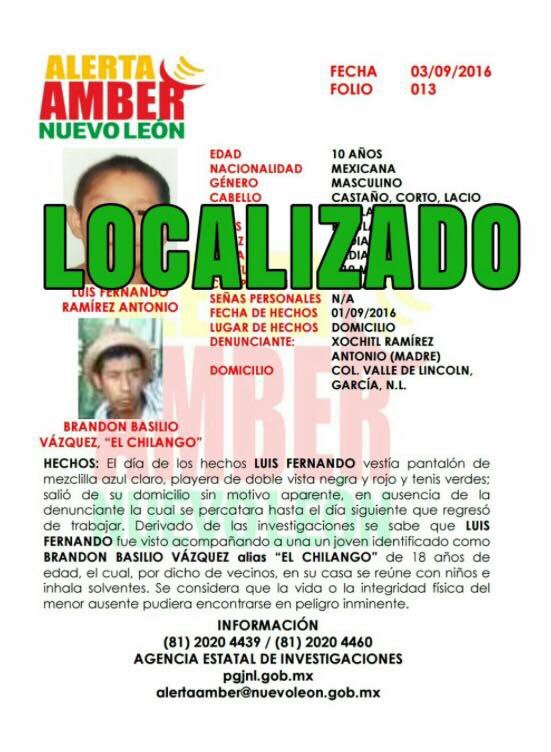 El menor Luis Fernando Ramírez Antonio, de 10 años, reportado como desaparecido desde el jueves en el municipio de García, fue localizado este Domingo en la vía pública en una plaza comercial en la avenida Lincoln.