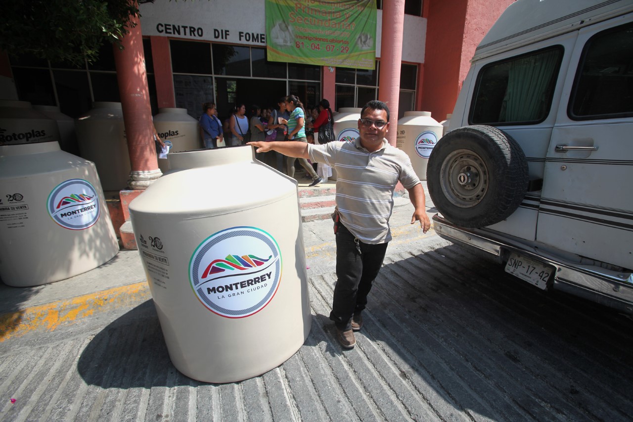El municipio de Monterrey en coordinación con la Congregación Mariana Trinitaria entregó este lunes 17 tinacos de agua y 22 toneladas de cemento, que beneficia a 54 familias de la Colonia Fomerrey 45.
