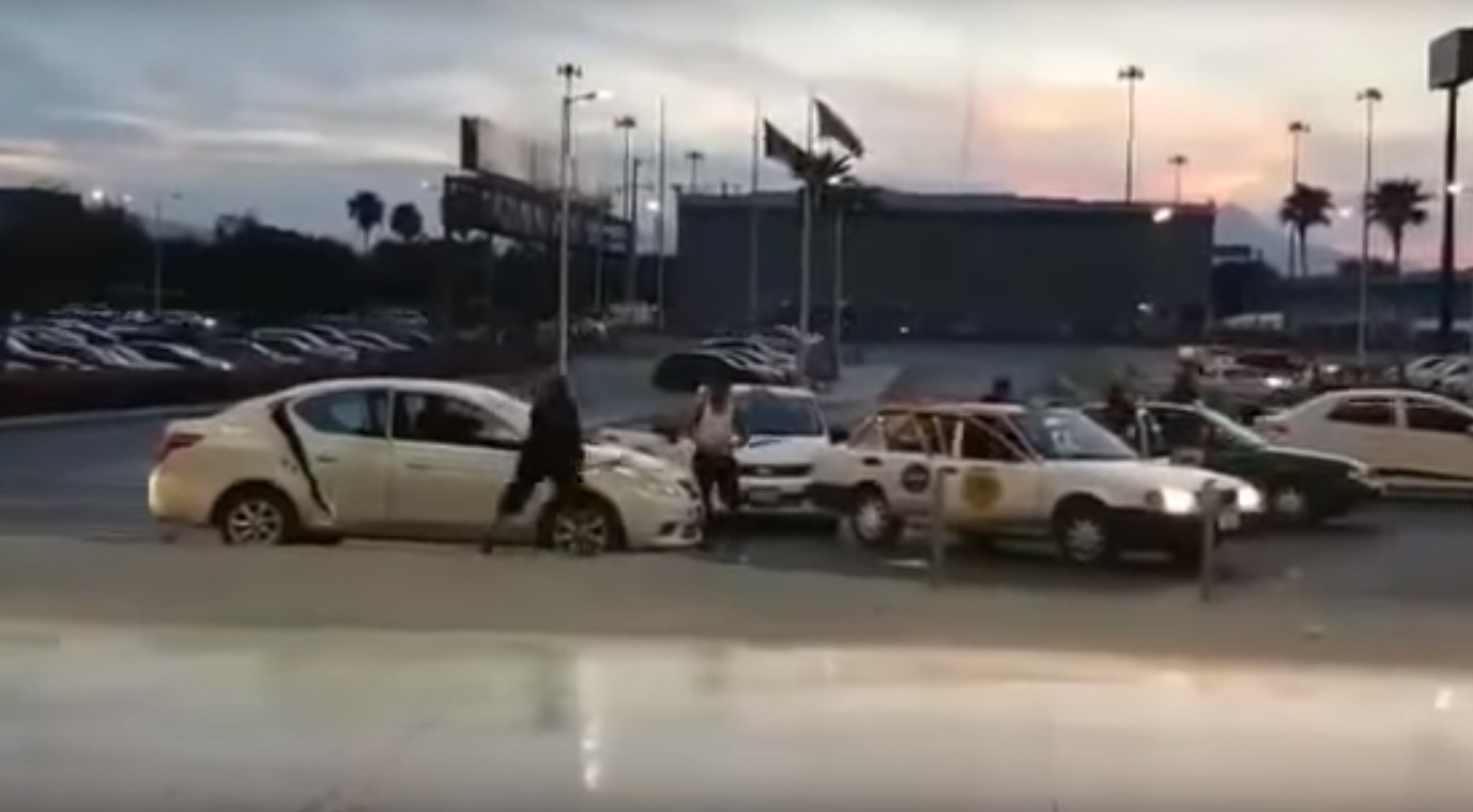 Por lo menos cinco hombres con bate en mano dañaron cristales y carrocería de un taxi independiente que llegó a dejar al centro comercial a una mujer y sus tres hijos, el pasado sábado en Plaza Sendero La Fe, en Apodaca