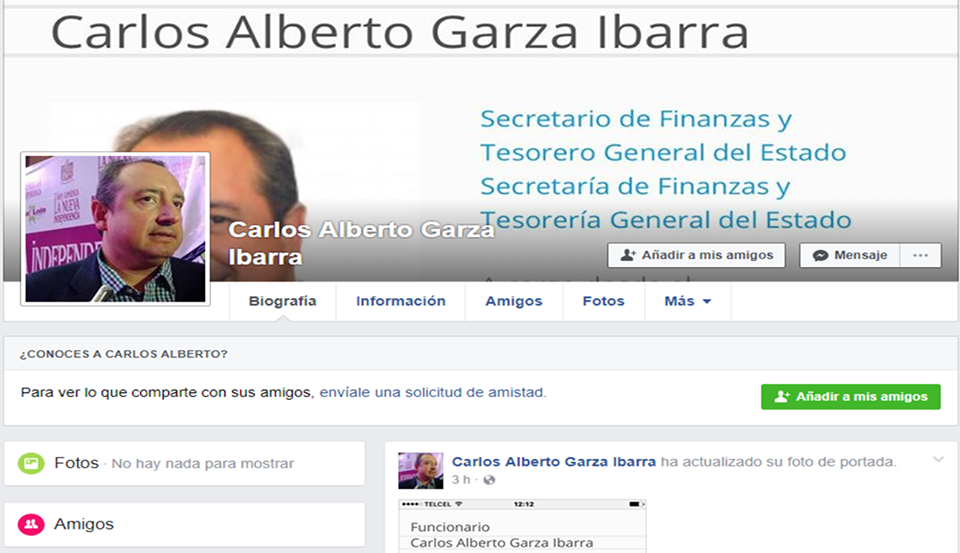 La Secretaría de Finanzas y Tesorería General del Estado alerto que hay un perfil falso en Facebook DEL Tesorero Carlos Garza Ibarra por lo que piden ignorar cualquier tema tratado en esa cuenta.