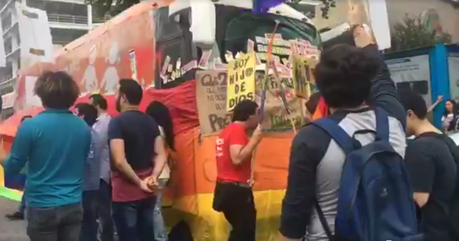 Con banderas de arcoíris y pancartas los representantes de la comunidad gay detuvieron la marcha del camión en el que viaja Juan Dabdoub, presidente del Consejo Mexicano de la Familia, cubriéndolo con la bandera gay y con decenas de calcomanías en contra de este movimiento.